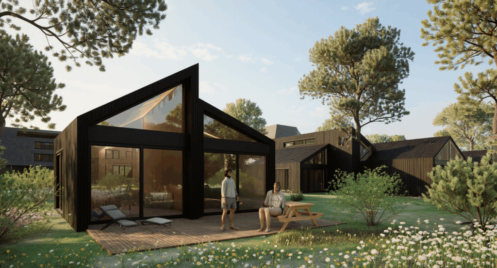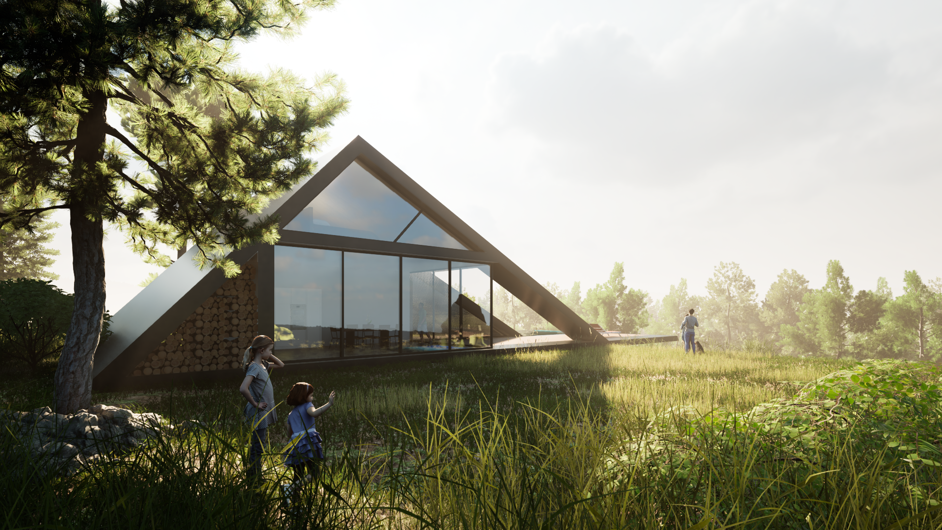 Ontwerp voor een moderne, duurzame en autonome vakantiewoning in de natuur.