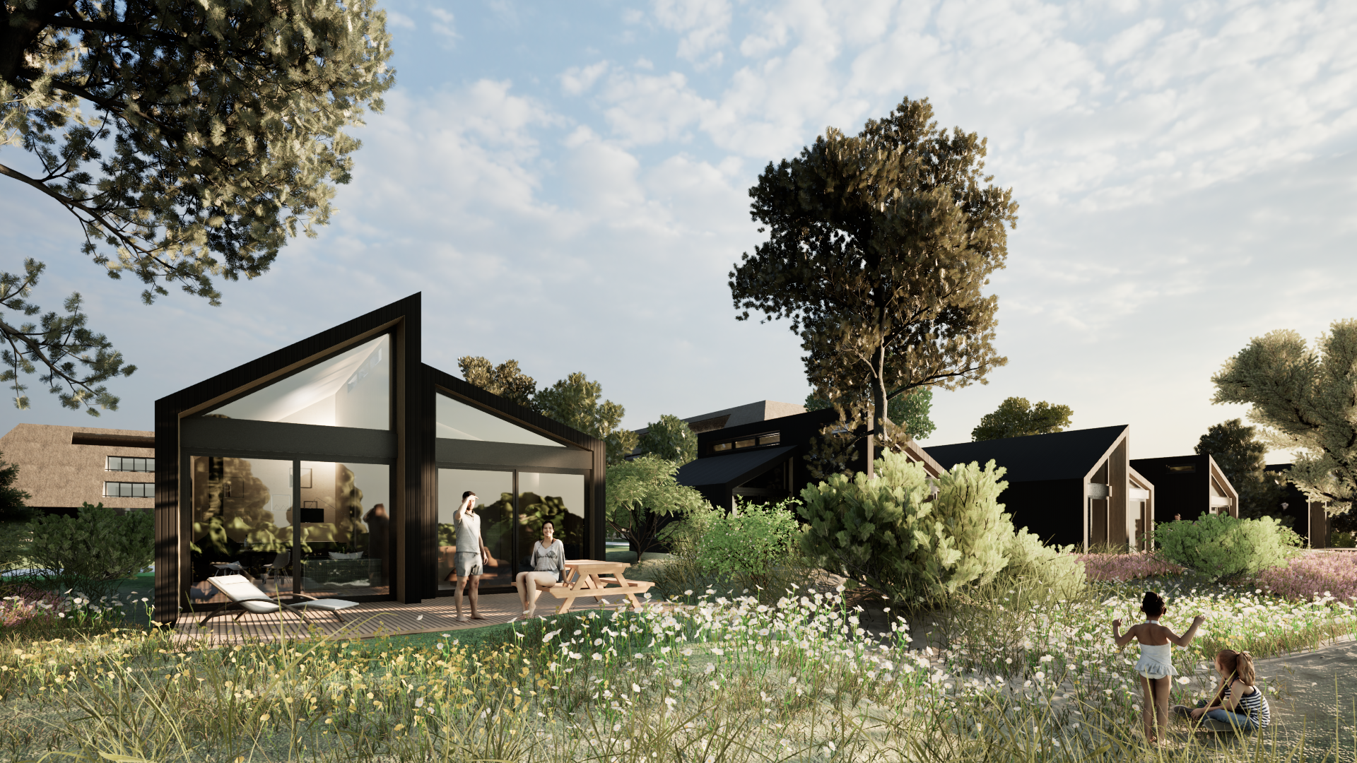 Stedenbouwkundig, architectonisch ontwerp en haalbaarheidstudie voor een vakantiepark met een lage impact op de omgeving en natuur.